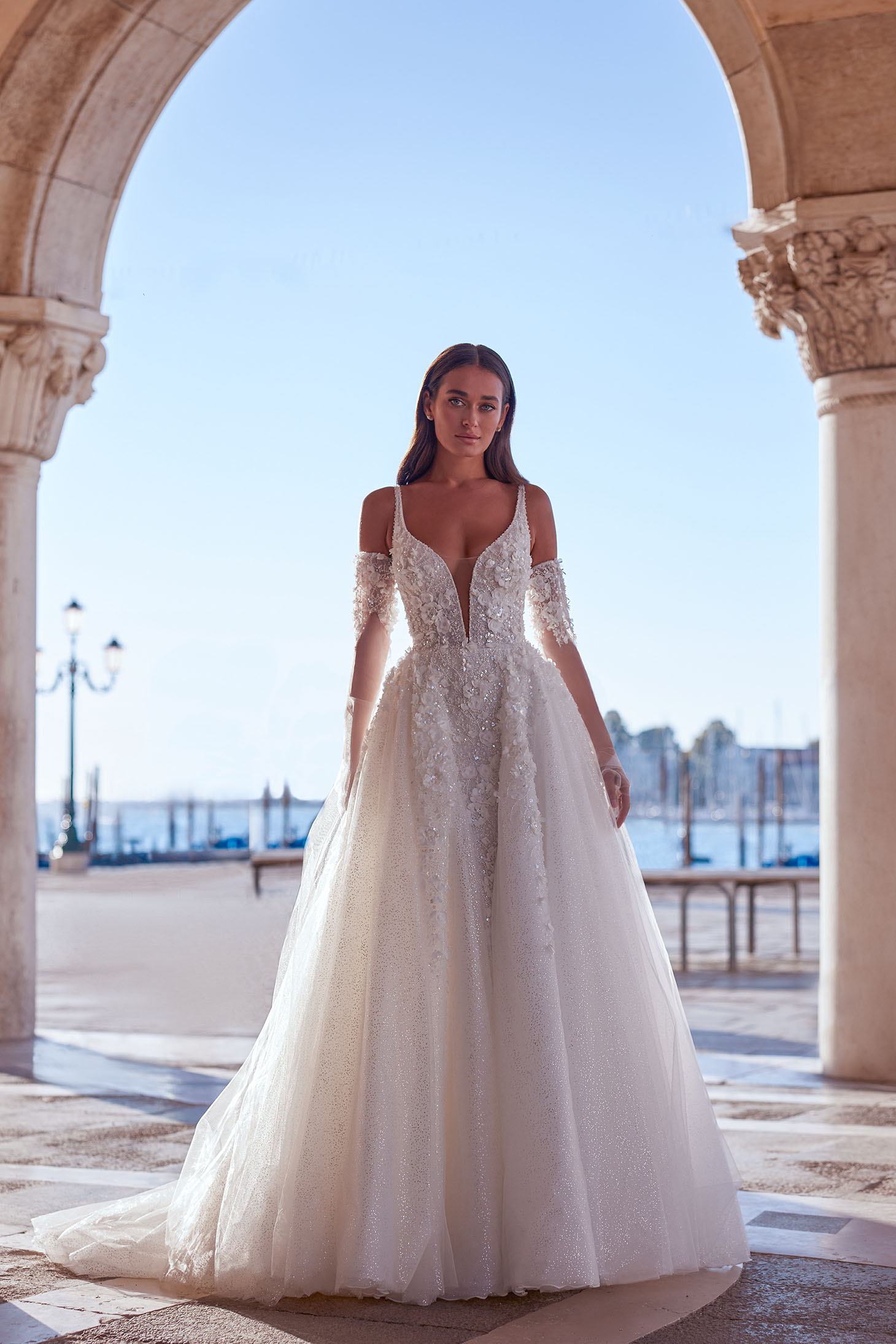 Der A-Linien-Schnitt ist der Klassiker unter den Brautkleidern. Er umschmeichelt jede Figur, betont die Taille und fällt locker nach unten. Perfekt für Bräute, die zeitlose Eleganz mit femininer Silhouette verbinden möchten.
